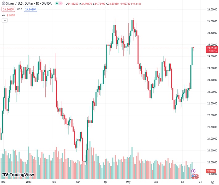 The price of silver, currently at 24.865 for the XAGUSD pair, is fluctuating at its highest point in nine weeks but has experienced its first decrease in three days. The viewpoint of @nehcap suggests that a retreat in the price is anticipated.