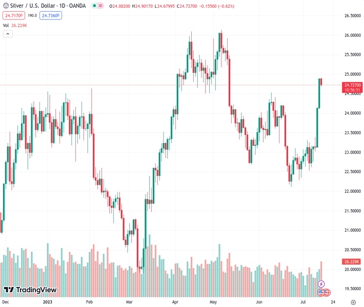 Upward-sloping 10-period Exponential Moving Average (EMA) at $23.74 is providing support to the Silver bulls.