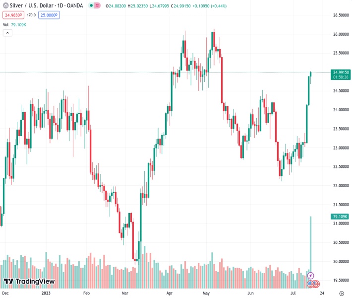 The XAG/USD gained interest due to falling yields during the week. As the US reported that the Core Consumer Price Index (CPI) from the US from June, dropped to 4.8% YoY in June, while the Core Producer Price Index (PPI) slid to 2.6% YoY in the same period, investors started to bet on a less-aggressive Federal Reserve.