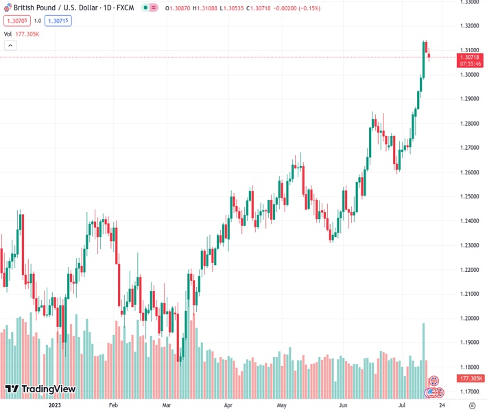 According to Credit Suisse, the GBP/USD pair, currently trading at 1.30662, is expected to remain optimistic and continue to rise towards the 78.6% retracement level of the decline that occurred between 2021 and 2022, which is located at 1.3414.