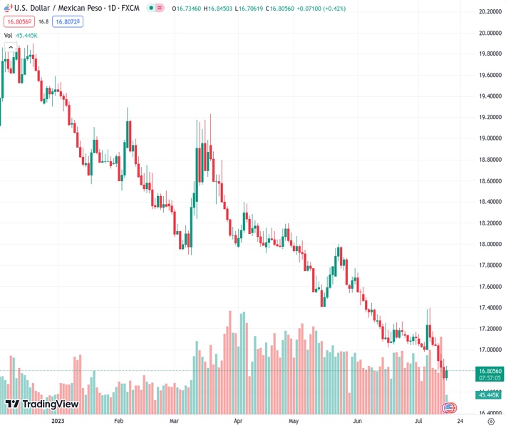 It is essential for a rebound to regain the 50-day moving average at a rate of 17.40 in order to gain confirmation. #USDMXN is currently at 16.8169.
