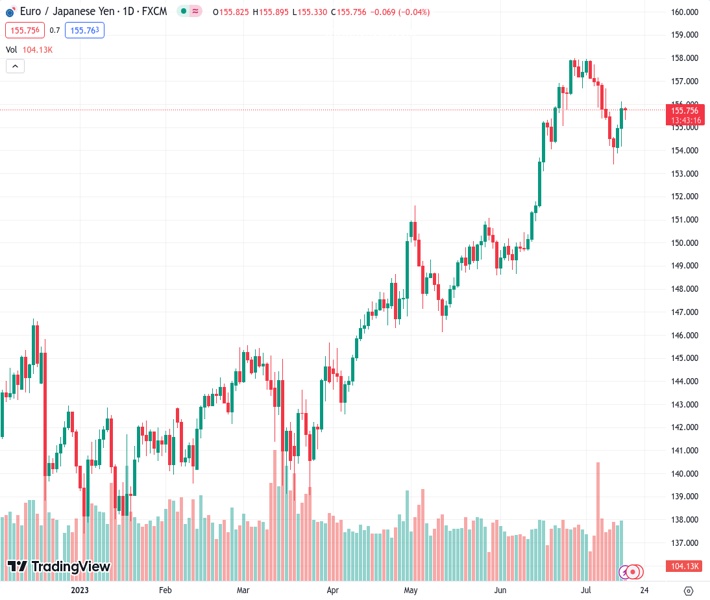 EURJPY currently trading at 155.54 at the time of writing. Pair opened at 155.85 and is trading with a change of -0.2 % .