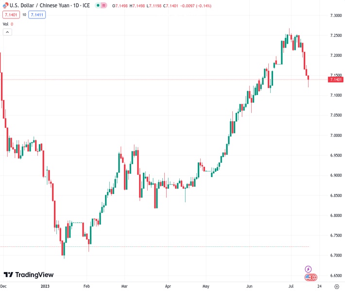The exchange rate for the US Dollar against the Chinese Yuan is currently at 7.15667. The People’s Bank of China (PBOC) has established a reference rate of 7.1326, slightly higher than the previous rate of 7.1318. Additionally, the one-year Medium-term Lending Facility (MLF) remains unchanged at 2.65%.