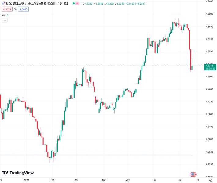 The exchange rate for USD to MYR is currently 4.53700, and it is anticipated that there is potential for it to decrease to 4.5100 according to UOB.
