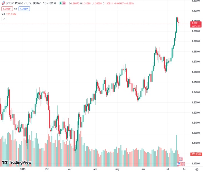 The GBPUSD currency pair experienced a decrease of 0.08% to reach a value of 1.30812, following the release of disappointing Chinese GDP data. This led to a surge in demand for safer investments, causing the exchange rate to fall below 1.3100.