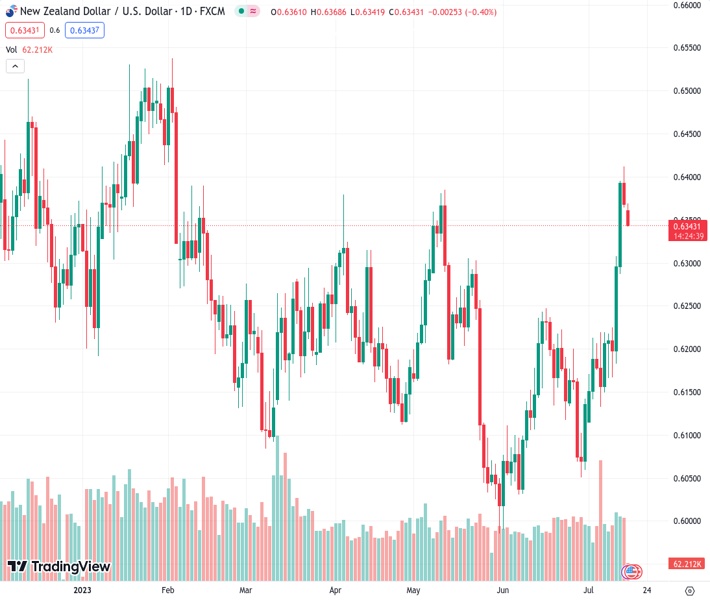 The New Zealand dollar to US dollar exchange rate at 0.63427 has decreased close to 0.6350, even though the US dollar index has been fluctuating.