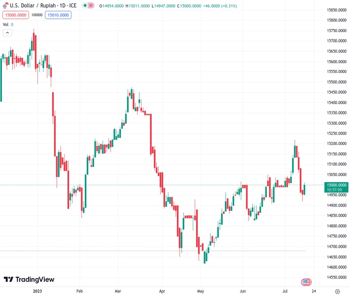 The US dollar to Indonesian rupiah exchange rate, currently at 15,000.0, is at risk of experiencing a more significant decrease in the near future, according to UOB.