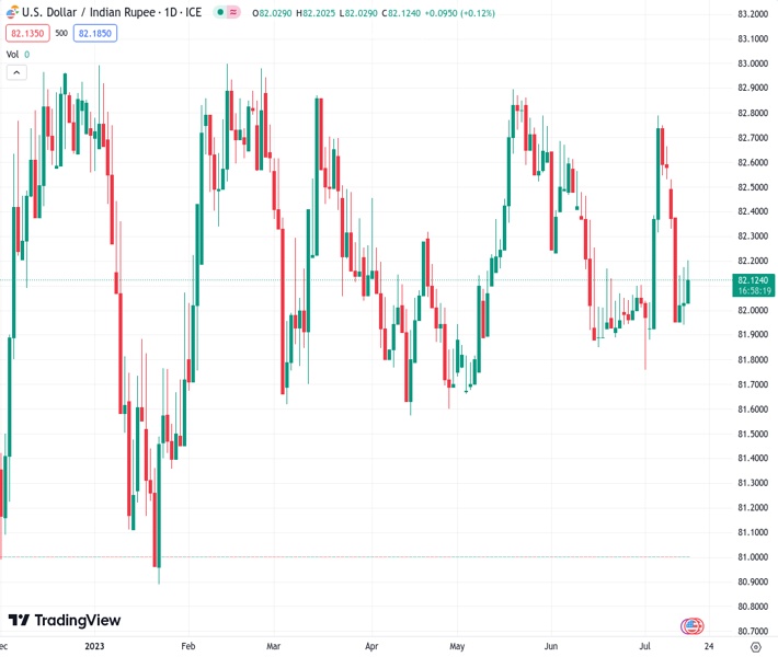 The USDINR exchange rate has risen for three consecutive days, reaching 82.1440, as investors aim for the 200-day exponential moving average. According to an analyst named Nehcap, they anticipate that the currency pair will continue to recover in the future.