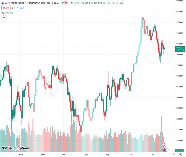 AUDJPY currently trading at 94.62 at the time of writing. Pair opened at 94.55 and is trading with a change of 0.07 % .