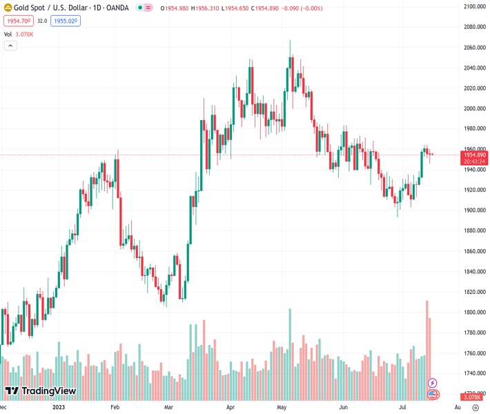 The current price of gold is 1,954.84 USD and it is remaining cautious after successfully resisting a decrease in value. This cautiousness is a result of concerns before the release of new data. According to the viewpoint of @nehcap, a further decline in the price of gold is anticipated.