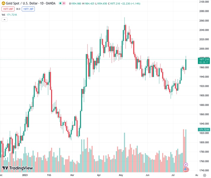 The price of gold against the US dollar, known as XAUUSD, increased close to $1,980, reaching its highest point since June 2nd.