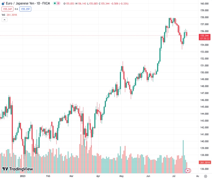 EURJPY currently trading at 155.61 at the time of writing. Pair opened at 155.83 and is trading with a change of -0.14 % .
