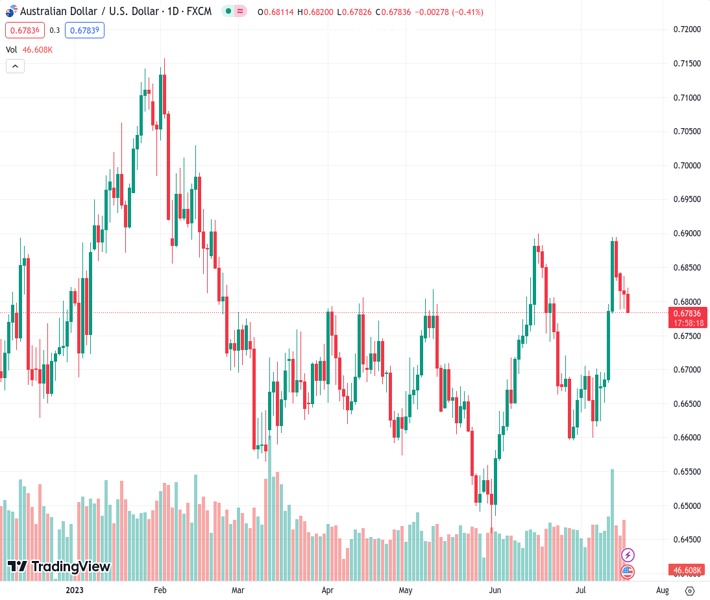 AUDUSD currently trading at 0.6785 at the time of writing. Pair opened at 0.6811 and is trading with a change of -0.38% % .