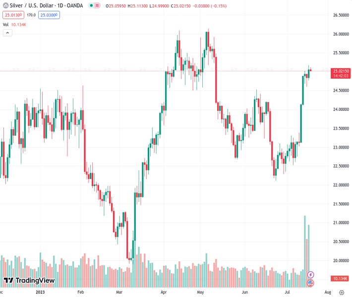 XAGUSD currently trading at 25.02 at the time of writing. Pair opened at 25.06 and is trading with a change of -0.16% % .