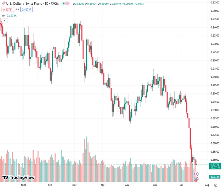 The USDCHF pair, with a value of 0.85786, has bounced back from its lowest point since January 2015. However, the prognosis from @nehcap suggests that any recovery will be minimal.