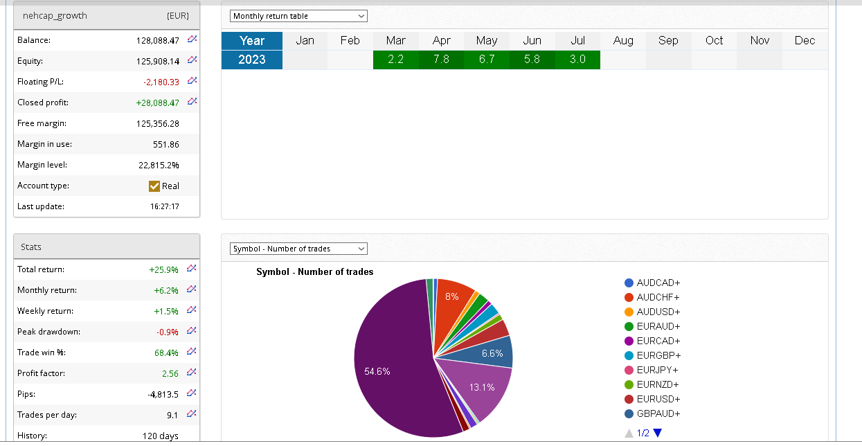 Some solid gains on AUDUSD and audCHF. July returns cross +3%. Low DD. The system makes positive consistent returns every month with a very low DD. Historical high on DD was 12%.