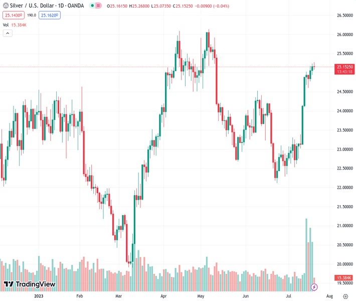 XAGUSD currently trading at 25.1 at the time of writing. Pair opened at 25.14 and is trading with a change of -0.16 % .