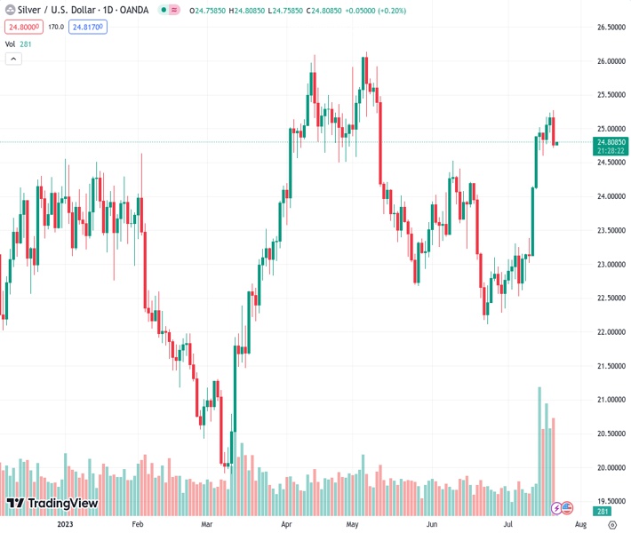 Silver prices are currently consolidating just below the $25.00 mark after recently experiencing a loss, due to mixed signals in the options market.
