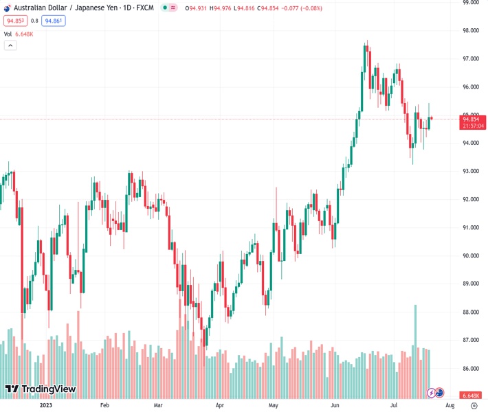 AUDJPY currently trading at 94.95 at the time of writing. Pair opened at 94.55 and is trading with a change of 0.42 % .