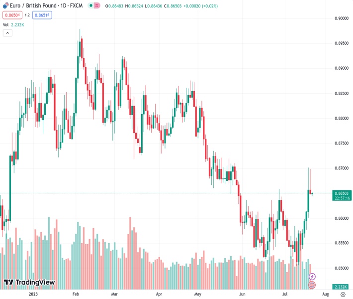 The EURGBP currency pair reached a peak of 0.8700 at the 100-day simple moving average (SMA) before ending the day at 0.8650.