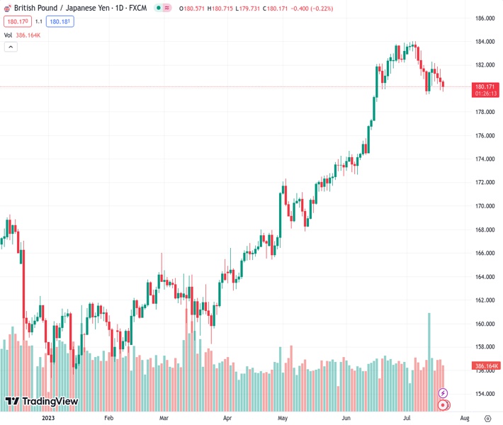 GBPJPY currently trading at 180.2 at the time of writing. Pair opened at 180.67 and is trading with a change of -0.26 % .