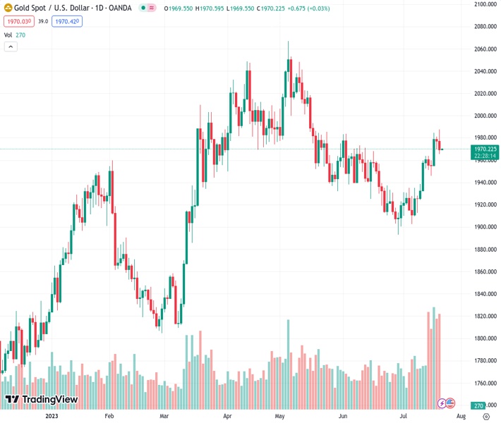 XAUUSD currently trading at 1970.56 at the time of writing. Pair opened at 1976.75 and is trading with a change of -0.31% % .