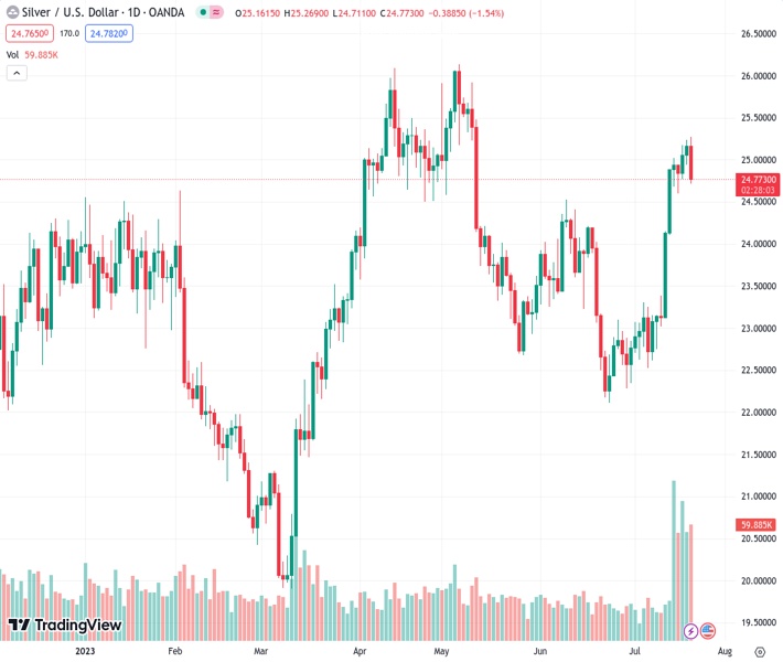 The XAGUSD, which was at 24.775, experienced a decrease of over 1% on Thursday, falling beneath the $25.00 level.