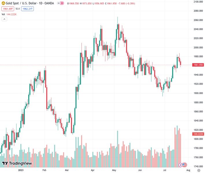 XAUUSD currently trading at 1961.84 at the time of writing. Pair opened at 1969.41 and is trading with a change of -0.38 % .