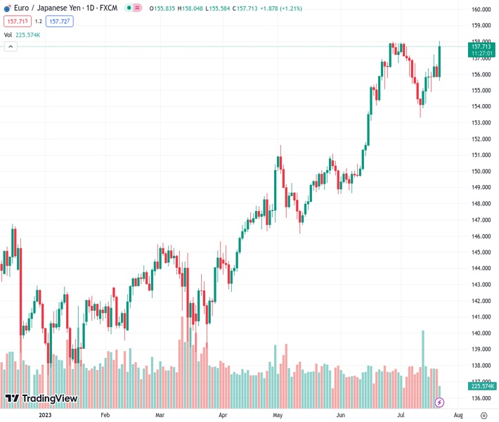 EURJPY currently trading at 157.77 at the time of writing. Pair opened at 155.9 and is trading with a change of 1.18 % .