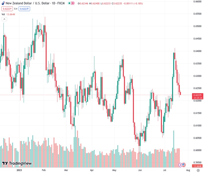 NZDUSD currently trading at 0.6226 at the time of writing. Pair opened at 0.6235 and is trading with a change of -0.14% % .