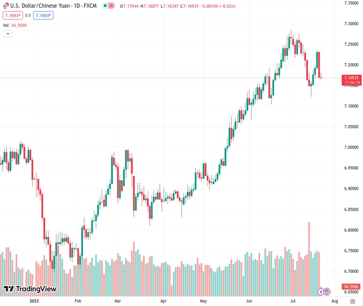 USDCNH currently trading at 7.1726 at the time of writing. Pair opened at 7.1754 and is trading with a change of -0.04% % .