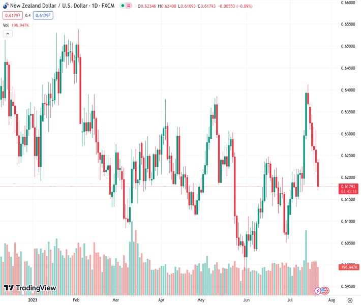 NZDUSD currently trading at 0.6175 at the time of writing. Pair opened at 0.6235 and is trading with a change of -0.96 % .