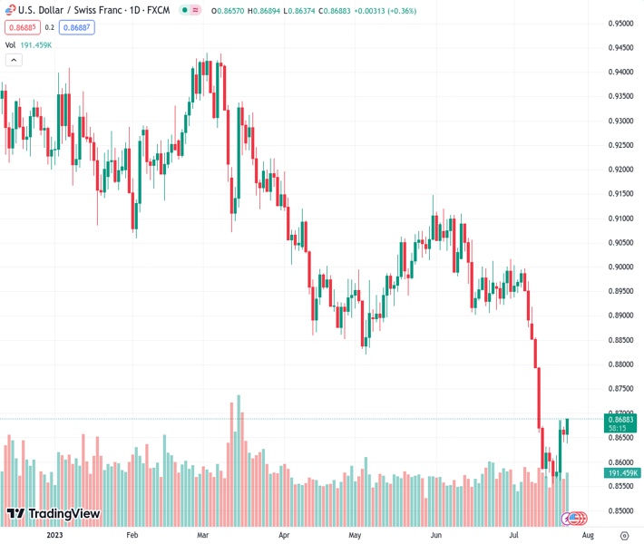 USDCHF currently trading at 0.8687 at the time of writing. Pair opened at 0.8656 and is trading with a change of 0.36 % .