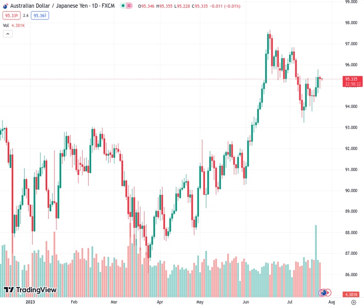 AUDJPY currently trading at 95.36 at the time of writing. Pair opened at 95.44 and is trading with a change of -0.08 % .