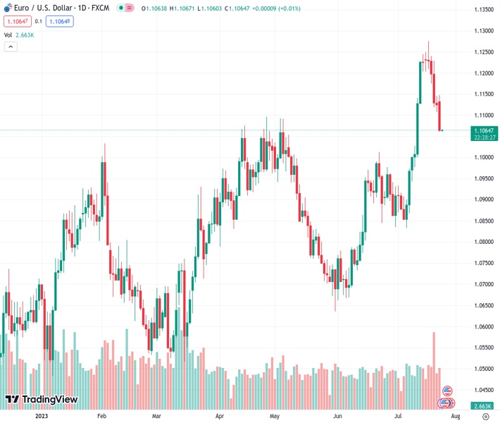 EURUSD currently trading at 1.1065 at the time of writing. Pair opened at 1.1127 and is trading with a change of -0.56% % .