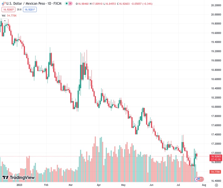 The USDMXN exchange rate, currently at 16.9175, is expected to decrease again in the near future and reach the recent low of 16.6930, according to Credit Suisse.