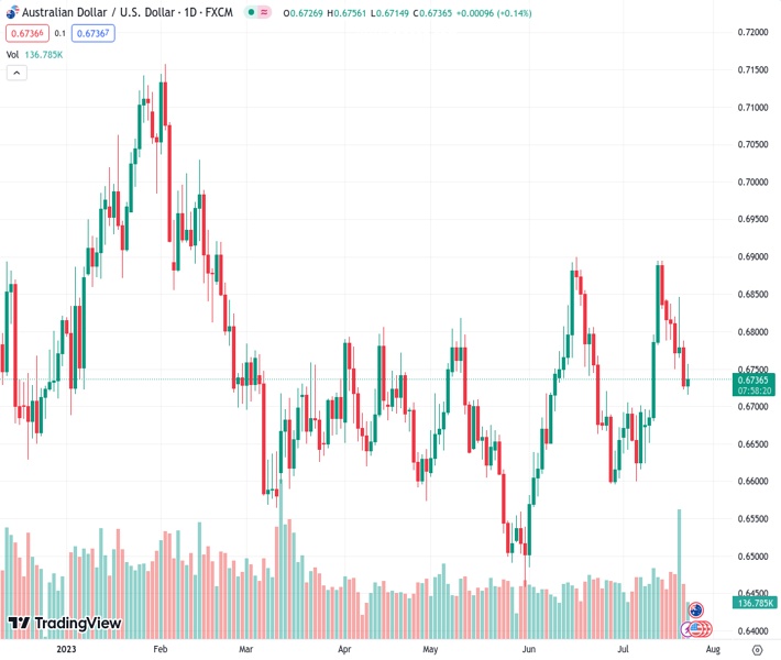 There has been a decline in the AUDUSD exchange rate at 0.67343 due to increased selling activity around 0.6750. This shift is a result of investors redirecting their attention to the policy decisions of the Federal Reserve.