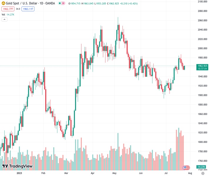 XAUUSD currently trading at 1959.69 at the time of writing. Pair opened at 1954.7 and is trading with a change of 0.26 % .