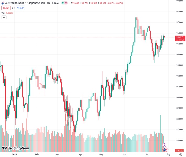 AUDJPY currently trading at 95.68 at the time of writing. Pair opened at 95.34 and is trading with a change of 0.36 % .