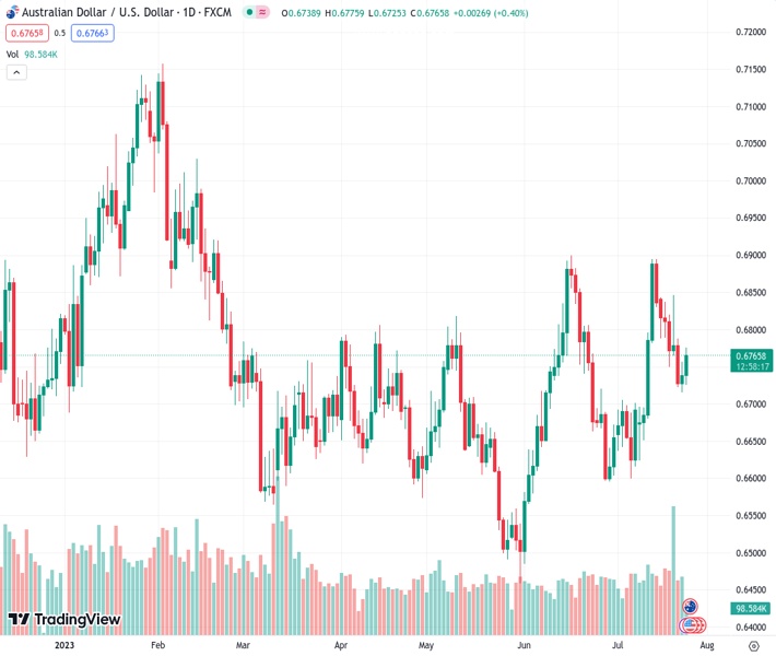 AUDUSD currently trading at 0.677 at the time of writing. Pair opened at 0.6739 and is trading with a change of 0.46 % .