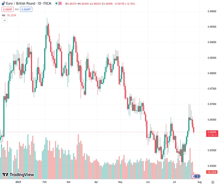 EURGBP currently trading at 0.8608 at the time of writing. Pair opened at 0.8627 and is trading with a change of -0.22 % .