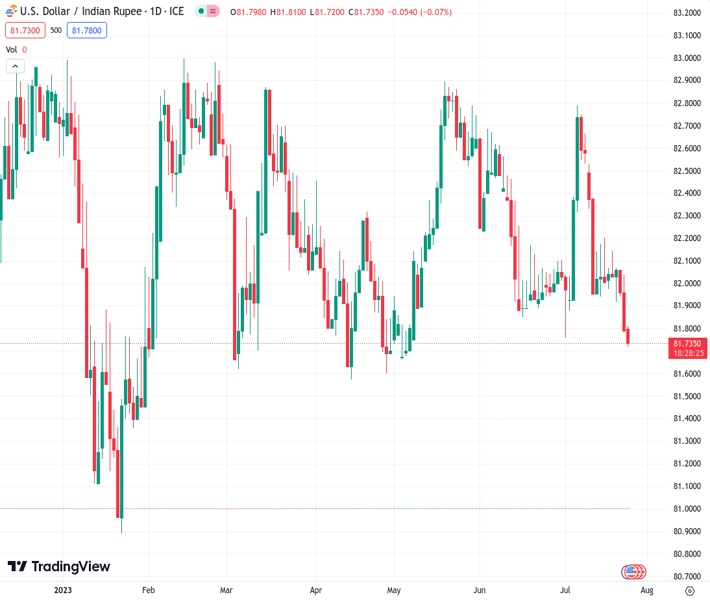 The exchange rate between the US dollar and the Indian rupee, currently at 81.7100, is declining and reaching a low that hasn’t been seen in multiple days. This marks the third consecutive day of losses.