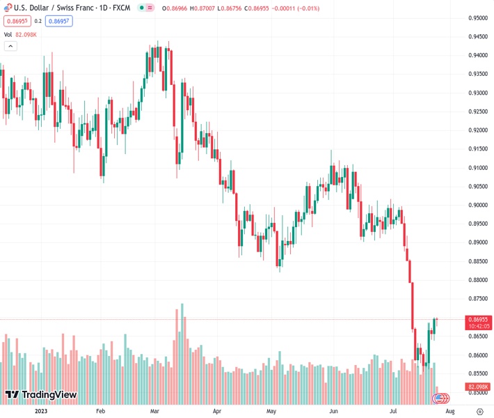 USDCHF currently trading at 0.8695 at the time of writing. Pair opened at 0.8697 and is trading with a change of -0.02 % .