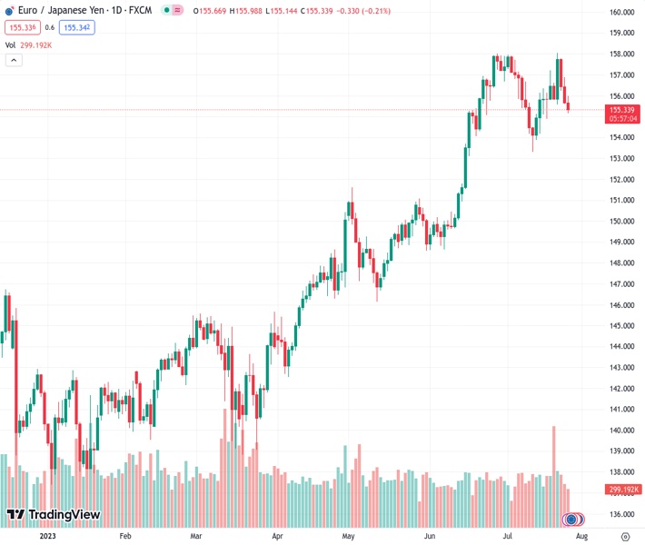 According to SocGen, the EURJPY currency pair has the potential to decline at a much quicker rate compared to its potential for an upward movement from its current level of 155.324.