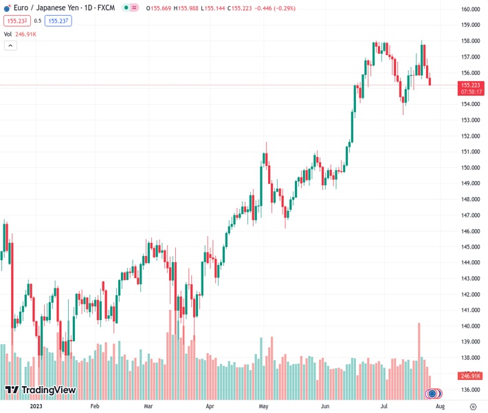 EURJPY currently trading at 155.24 at the time of writing. Pair opened at 155.73 and is trading with a change of -0.31 % .