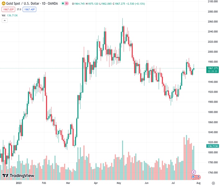 • The Gold price has been whipsawed after the Federal Reserve, Fed, raised its interest rate decision by a 25 bps rate hike to 5.25-5.50%, as expected. At the time of writing, Gold is volatile between $1,973 and $1,965 so far as the market digests the statement and key points as follows: