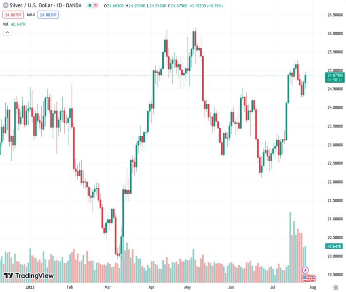 XAGUSD currently trading at 24.91 at the time of writing. Pair opened at 24.68 and is trading with a change of 0.93 % .