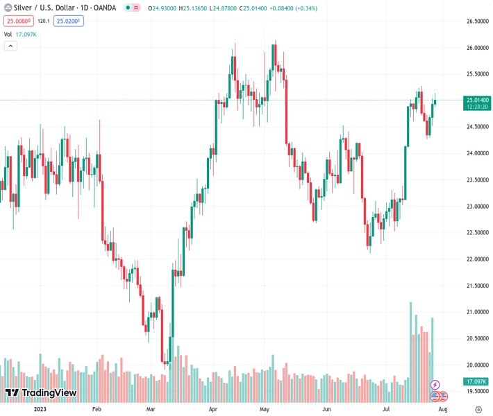 XAGUSD currently trading at 25.05 at the time of writing. Pair opened at 24.93 and is trading with a change of 0.48 % .
