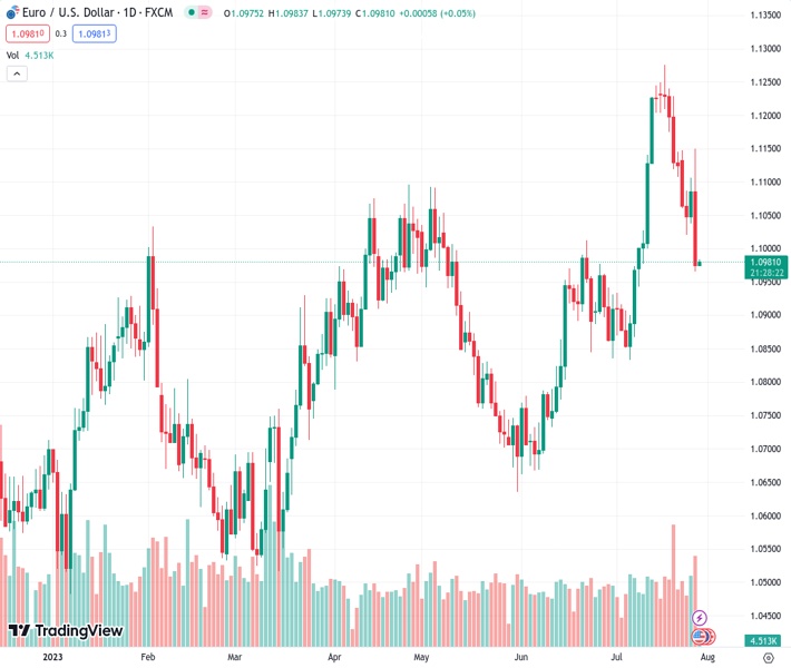 EURUSD currently trading at 1.0983 at the time of writing. Pair opened at 1.1086 and is trading with a change of -0.93% % .