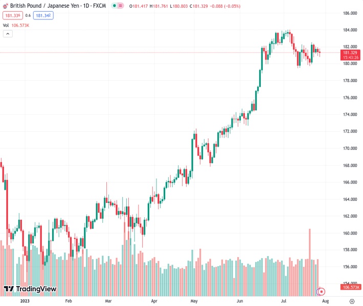 GBPJPY currently trading at 181.4 at the time of writing. Pair opened at 181.5 and is trading with a change of -0.02 % .